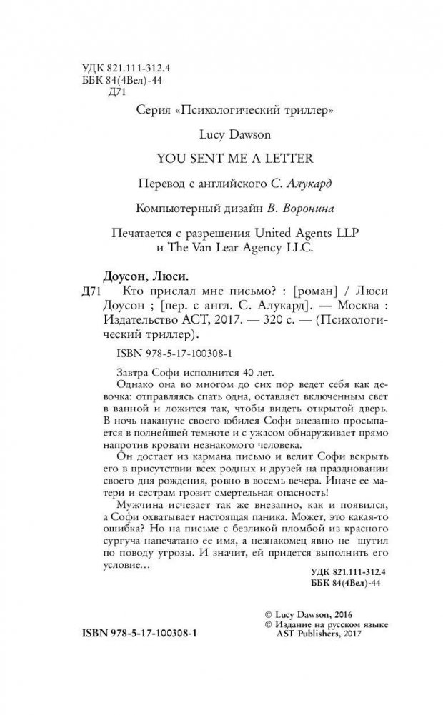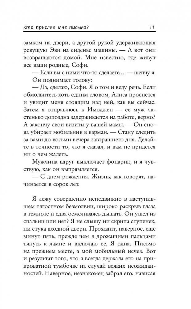 Завтра Софи исполнится 40 лет. Однако она во многом до сих пор ведет себя как девочка: отправляясь спать одна, оставляет включенным свет в ванной и ложится так, чтобы видеть открытой дверь. В ночь накануне своего юбилея Софи внезапно просыпается в полнейшей темноте и с ужасом обнаруживает прямо напротив кровати незнакомого человека. Он достает из кармана письмо и велит Софи вскрыть его в присутствии всех родных и друзей на праздновании своего дня рождения, ровно в восемь вечера. Иначе ее матери и сестрам грозит смертельная опасность! Мужчина исчезает так же внезапно, как и появился, а Софи охватывает настоящая паника. Может, это какая-то ошибка? Но на письме с безликой пломбой из красного сургуча напечатано ее имя, а незнакомец явно не шутил по поводу угрозы. И значит, ей придется выполнить его условие…