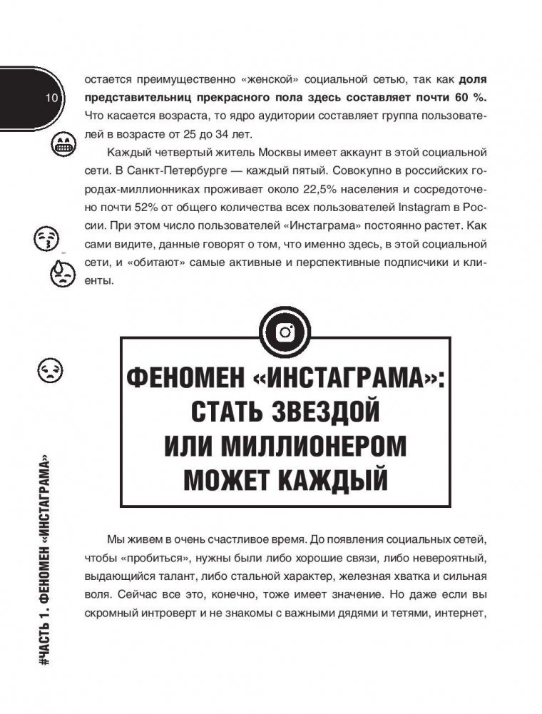 Для чего вы заходите в «Инстаграм»? Посмотреть, как дела у знакомых? Выложить фотографии со вчерашней вечеринки? Развеяться и отдохнуть? Лично я вот уже два года захожу в «Инстаграм», чтобы заработать. Немного цифр, которые лучше любых слов объяснят вам, чем может быть полезен «Инстаграм»: -17 000 000 чистой прибыли у медицинской клиники в месяц (полтора года назад ее не существовало вообще); -60 000 000 чистой прибыли за один курс у инфобизнесмена; -4 000 000 ежемесячной чистой прибыли от размещения рекламы в аккаунте в «Инстаграме» у известного блогера (не звезды).Хотите таких же результатов? В этой книге вы найдете руководство к действию без воды и лирических отступлений и сможете создать аккаунт в «Инстаграме», который будет работать на вас. Новые знакомства, рост клиентской базы и, конечно, доход – все это может дать вам и вашему бизнесу эта социальная сеть. Для того чтобы эта книга была для вас максимально эффективным навигатором по «Инстаграму», в конце практически каждой главы есть конкретные задания, выполняя которые, вы шаг за шагом будете двигаться к созданию собственного успешного бизнеса в «Инстаграме». Также в конце книги вас ждет сюрприз – интервью с самыми знаковыми персонами российского «Инстаграма», с настоящими звездами этой социальной сети. Уверена, их рассуждения об «Инстаграме» послужат вам отличной мотивацией и приоткроют дверь в этот интересный и перспективный мир!