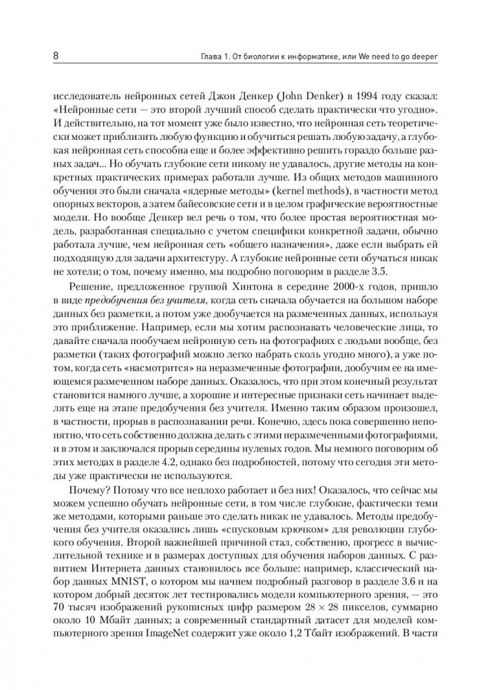 Перед вами — первая книга о глубоком обучении, написанная на русском языке. Глубокие модели оказались ключом, который подходит ко всем замкам сразу: новые архитектуры и алгоритмы обучения, а также увеличившиеся вычислительные мощности и появившиеся огромные наборы данных привели к революционным прорывам в компьютерном зрении, распознавании речи, обработке естественного языка и многих других типично «человеческих» задачах машинного обучения. Эти захватывающие идеи, вся история и основные компоненты революции глубокого обучения, а также самые современные достижения этой области доступно и интересно изложены в книге. Максимум объяснений, минимум кода, серьезный материал о машинном обучении и увлекательное изложение — в этой уникальной работе замечательных российских ученых и интеллектуалов.