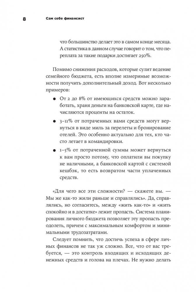 Отсутствие финансовой грамотности приводит к тому, что какая бы у нас ни была зарплата, мы не умеем планировать бюджет, никак не можем накопить на свою мечту, надеемся на государственную пенсию и начинаем жить в кредит. При этом есть мнение, что управление личными финансами слишком сложно и вообще это только для богатых. Цель этой книги — доказать, что любой человек, с любым уровнем доходов может улучшить свое благосостояние, следуя простым правилам. Финансовый консультант Анастасия Тарасова на понятных жизненных примерах рассказывает, как вести учет расходов и доходов, как оптимизировать свои активы и пассивы, как и куда инвестировать и накопить на пенсию и на будущее детей. В книге рассказывается о том: как заставить деньги работать; что такое подушка безопасности, и зачем она нужна; как оптимизировать доходы и расходы; как правильно ставить финансовые цели; как правильно управлять активами и пассивами; что происходит с пенсионной системой; как сформировать пенсию самостоятельно; как накопить на образование и жилье своим детям.