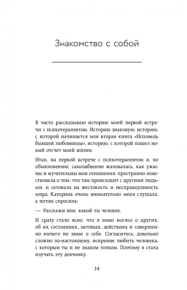 «Большинство из вас с такой легкостью забивает на себя, пытается постоянно „подстроиться“, „научиться не чувствовать“, „потерпеть“, что складывается впечатление — в кладовке у этих людей припрятана еще одна жизнь. Вот сейчас они в этой поиздеваются над собой, просрут, простите, всего и побольше, а там-то, потом, эге-гей! — как разойдутся, все наверстают.