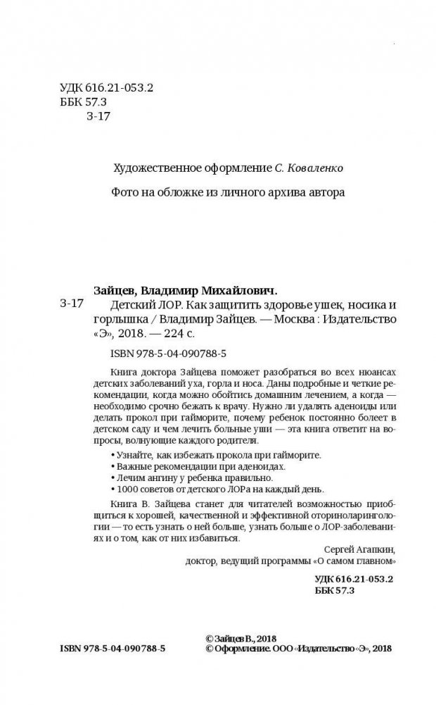 Книга доктора Зайцева поможет разобраться во всех нюансах детских заболеваний уха, горла и носа. Даны подробные и четкие рекомендации, когда можно обойтись домашним лечением, а когда — необходимо срочно бежать к врачу. Нужно ли удалять аденоиды или делать прокол при гайморите, почему ребенок постоянно болеет в детском саду и чем лечить больные уши — эта книга ответит на вопросы, волнующие каждого родителя. - Узнайте, как избежать прокола при гайморите. - Важные рекомендации при аденоидах. - Лечим ангину у ребенка правильно. - 1000 советов от детского ЛОРа на каждый день. Книга В. Зайцева станет для читателей возможностью приобщиться к хорошей, качественной и эффективной оториноларингологии — то есть узнать о ней больше, узнать больше о ЛОР-заболеваниях и о том, как от них избавиться.