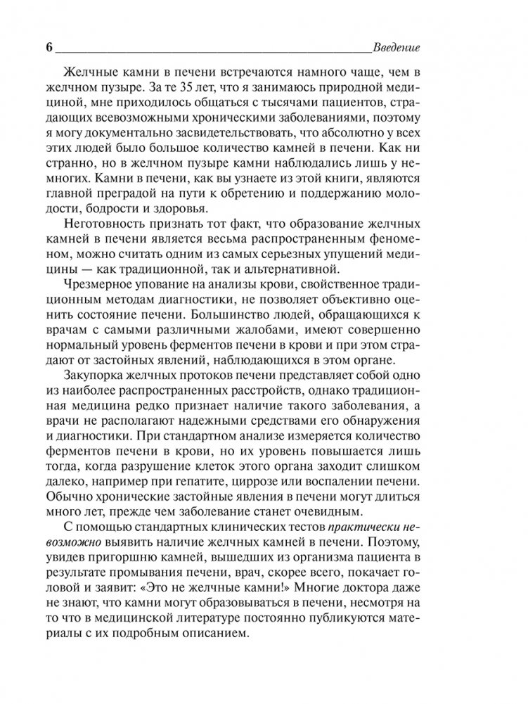 В этом существенно расширенном и дополненном издании всемирно известного бестселлера Андреас Мориц раскрывает наиболее распространенную, но редко признаваемую причину заболеваний — закупорку камнями желчных протоков печени. Книга позволяет понять, какие сложные функции выполняет печень, к каким последствиям приводит образование камней в этом органе и желчном пузыре и почему это состояние служит причиной самых распространенных в современном мире заболеваний. Она позволяет установить у себя наличие камней и принять самостоятельные меры по их безболезненному удалению в домашних условиях.