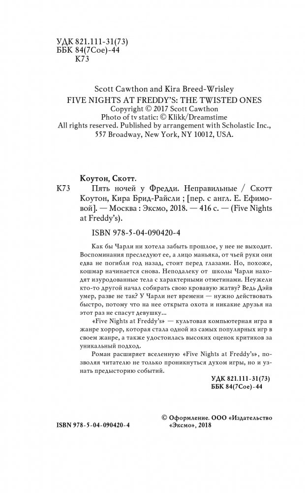 Как бы Чарли ни хотела забыть прошлое, у нее не выходит. Воспоминания преследуют ее, а лицо маньяка, от чьей руки они едва не погибли год назад, стоит перед глазами. Но, похоже, кошмар начинается снова. Неподалеку от школы Чарли находят изуродованные тела с характерными отметинами. Неужели кто-то другой начал собирать свою кровавую жатву? Ведь Дэйв умер, разве не так? У Чарли нет времени — нужно действовать быстро, потому что на нее открыта охота и никакие друзья на этот раз не спасут девушку... "Five Nights at Freddy’s" — культовая компьютерная игра в жанре хоррор, которая стала одной из самых популярных игр в своем жанре, а также удостоилась высоких оценок критиков за уникальный подход. Роман расширяет вселенную "Five Nights at Freddy’s", позволяя читателю не только проникнуться духом игры, но и узнать предысторию событий.