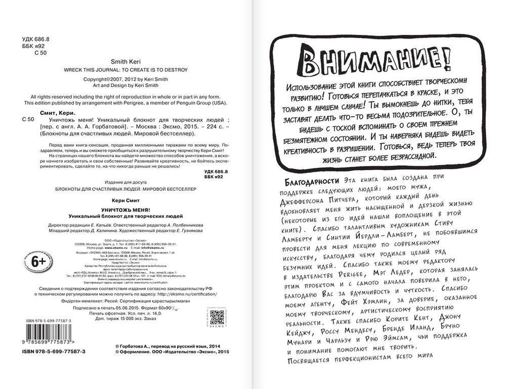 Перед вами книга-сенсация, проданная миллионными тиражами по всему миру. Поздравляем, теперь и вы сможете приобщиться к разрушительному творчеству Кери Смит! На страницах нашего блокнота вы найдете множество способов уничтожения, а вскоре начнете изобретать и свои собственные! Развивайте креативность, не бойтесь экспериментировать, сделайте то, на что никогда раньше не решались!