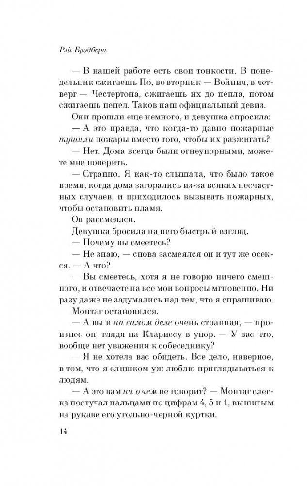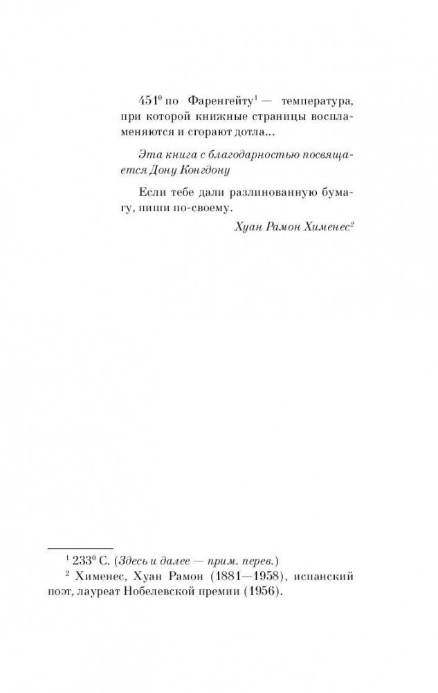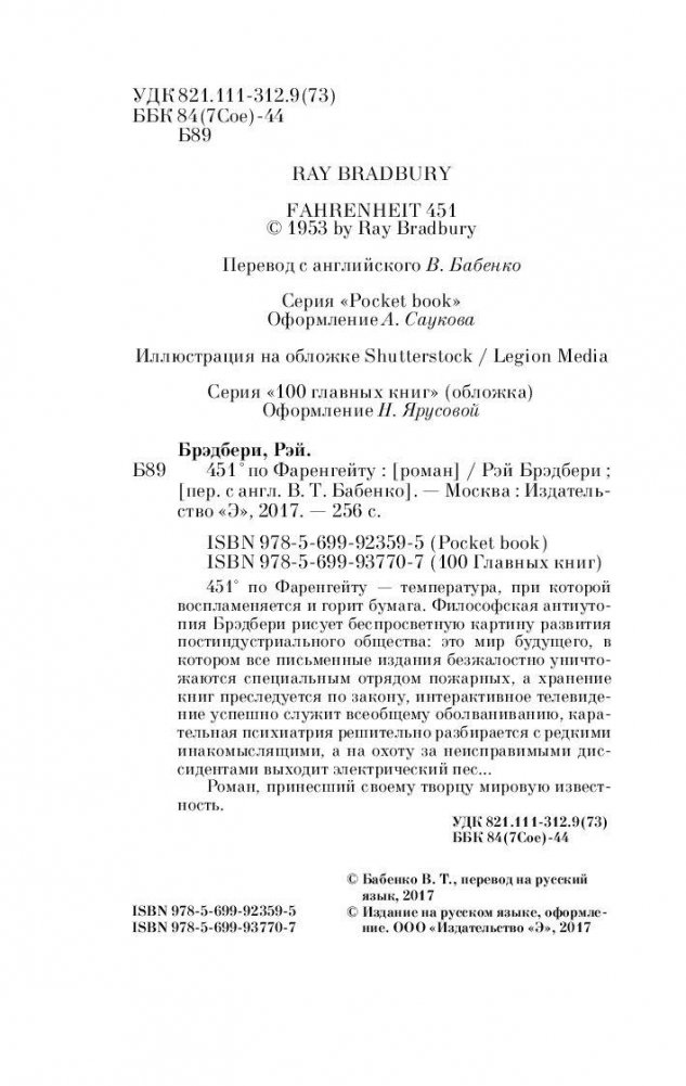 При температуре 451° по Фаренгейту воспламеняется бумага. Гай Монтэг пожарный, только он не тушит огонь, он сжигает книги. Будущее человечества избавлено от негативных эмоций, все время людей посвящено исключительно удовольствиям и развлекательным телепередачам. А к тем, кто не желает мириться со столь "благополучным" жизненным укладом, и предпочитают телевидению литературу, наведываются отряды пожарных и сжигают запрещенные книги вместе с домами их владельцев. Именно эта философская антиутопия принесла всемирную славу Рэю Брэдбери, одному из самых значимых мировых фантастов. И помните, есть преступления хуже, чем сжигать книги, например - не читать их.