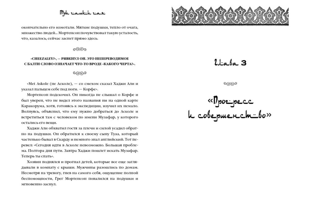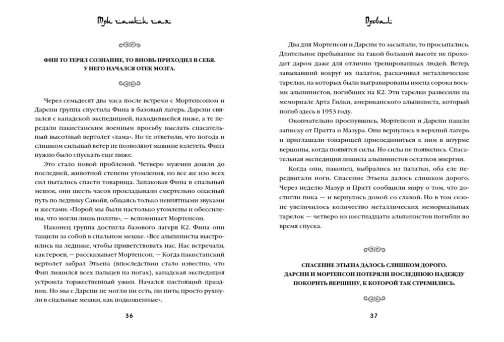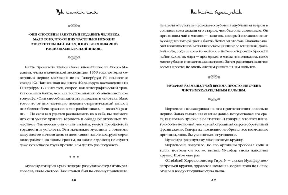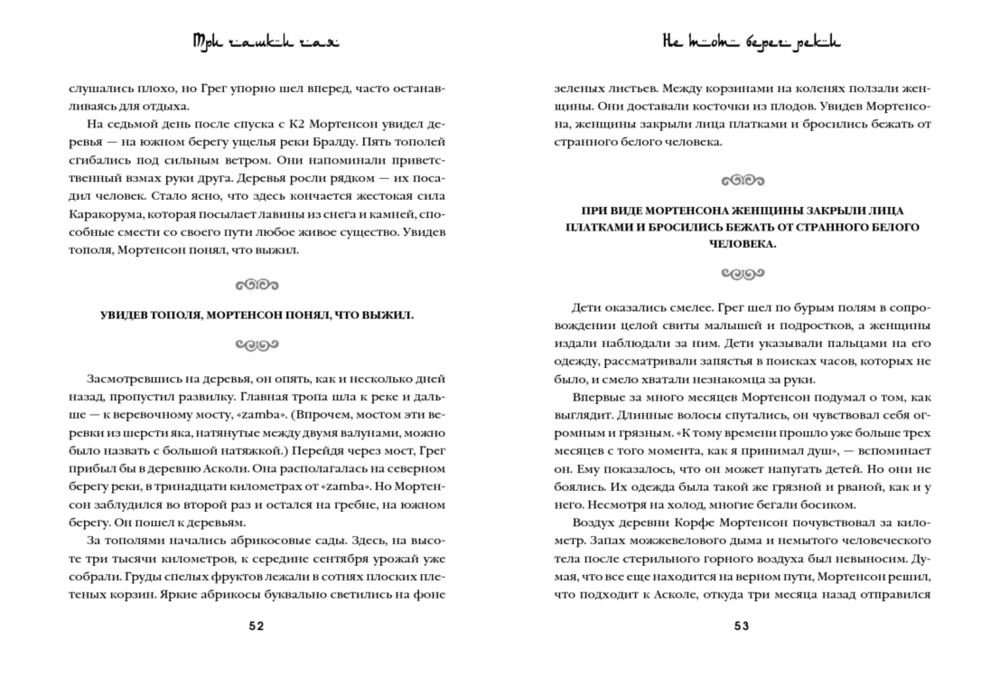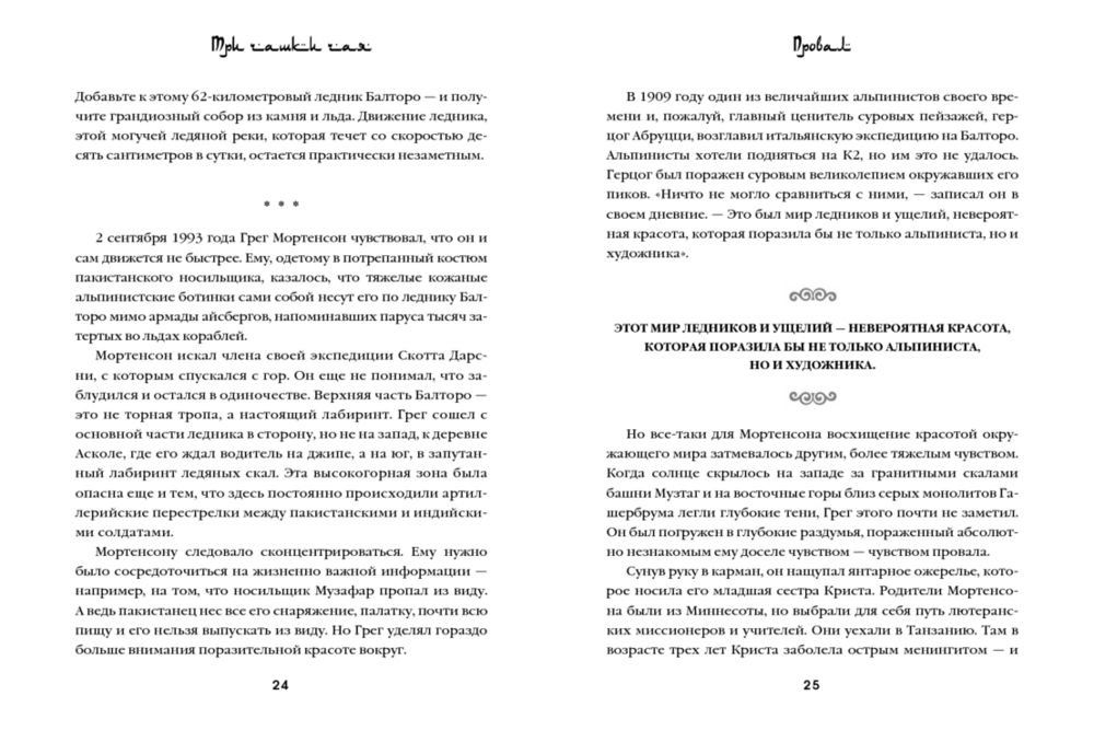 «Три чашки чая» – это поразительная история о том, как самый обычный человек, не обладая ничем кроме решительности, способен в одиночку изменить мир. Грег Мортенсон подрабатывал медбратом, ночевал в машине, а свое немногочисленное имущество держал в камере хранения. В память о погибшей сестре он решил покорить самую сложную гору К2. Эта попытка чуть ли не стоила ему жизни, если бы не помощь местных жителей. Несколько дней, проведенных в отрезанной от цивилизации пакистанской деревушке, потрясли Грега настолько, что он решил собрать необходимую сумму и вернуться в Пакистан, чтобы построить школу для деревенских детей. Сегодня Мортенсон руководит одной из самых успешных благотворительных организаций в мире, он построил 145 школ и несколько десятков женских и медицинских центров в самых бедных деревнях Пакистана и Афганистана. Книга была издана в 48 странах и в каждой из них стала бестселлером. Самого Грега Мортенсона дважды номинировали на Нобелевскую премию мира.