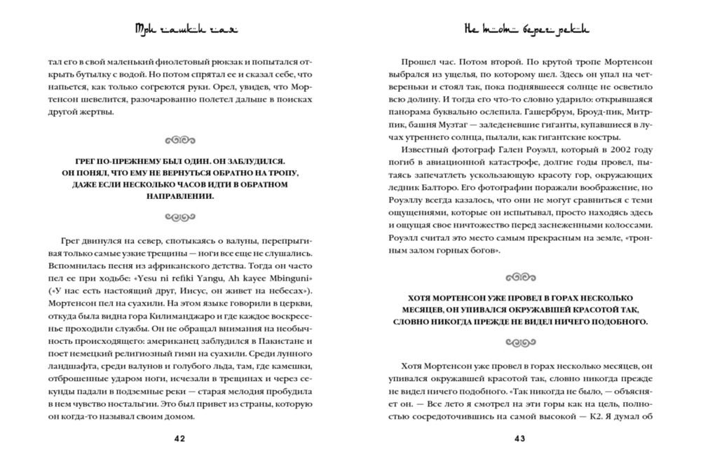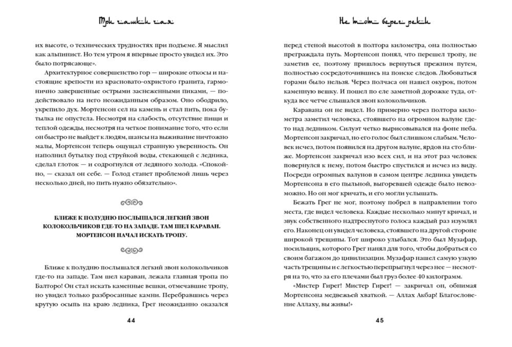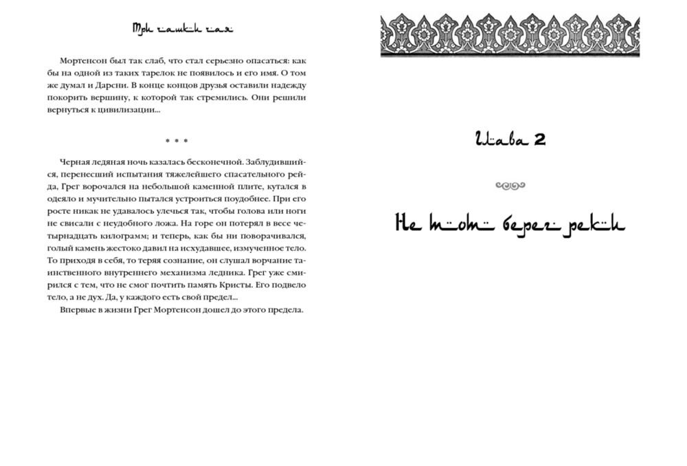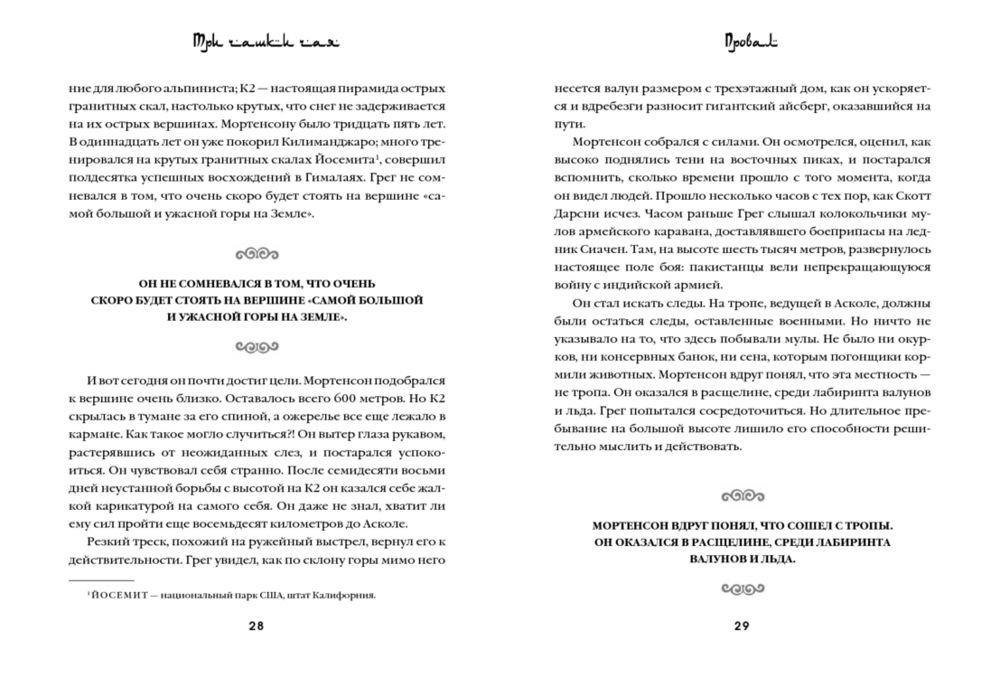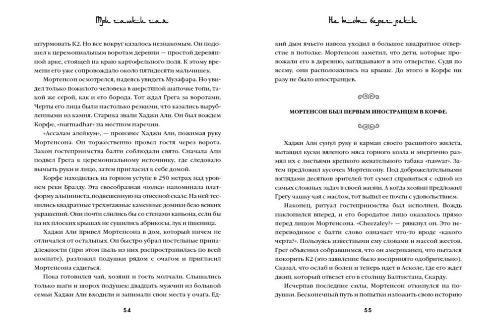 «Три чашки чая» – это поразительная история о том, как самый обычный человек, не обладая ничем кроме решительности, способен в одиночку изменить мир. Грег Мортенсон подрабатывал медбратом, ночевал в машине, а свое немногочисленное имущество держал в камере хранения. В память о погибшей сестре он решил покорить самую сложную гору К2. Эта попытка чуть ли не стоила ему жизни, если бы не помощь местных жителей. Несколько дней, проведенных в отрезанной от цивилизации пакистанской деревушке, потрясли Грега настолько, что он решил собрать необходимую сумму и вернуться в Пакистан, чтобы построить школу для деревенских детей. Сегодня Мортенсон руководит одной из самых успешных благотворительных организаций в мире, он построил 145 школ и несколько десятков женских и медицинских центров в самых бедных деревнях Пакистана и Афганистана. Книга была издана в 48 странах и в каждой из них стала бестселлером. Самого Грега Мортенсона дважды номинировали на Нобелевскую премию мира.