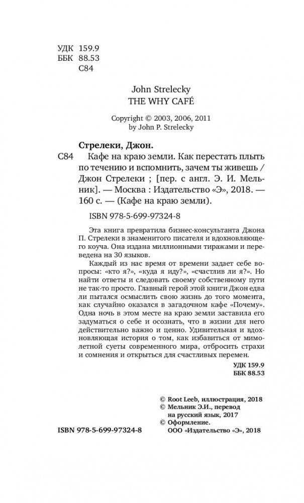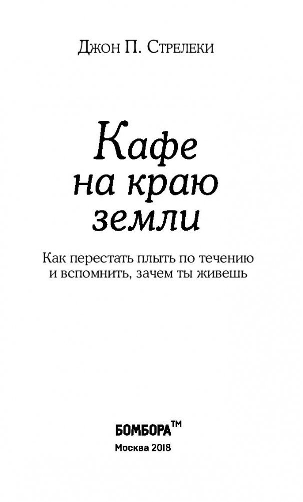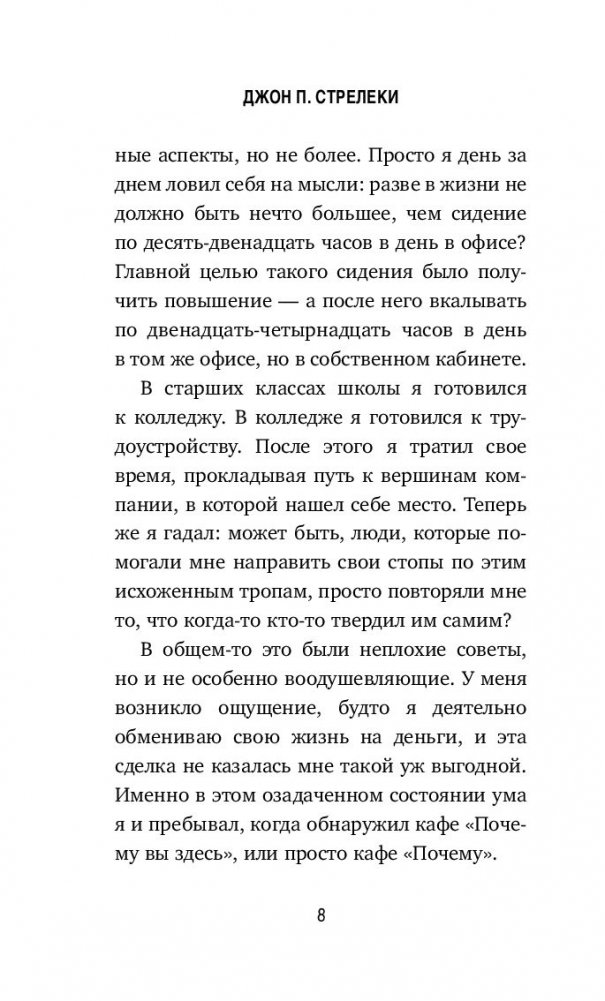 Эта книга превратила бизнес-консультанта Джона П. Стрелеки в знаменитого писателя и вдохновляющего коуча. Она издана миллионными тиражами и переведена на 30 языков. Каждый из нас время от времени задает себе вопросы: "кто я?", "куда я иду?", "счастлив ли я?". Но найти ответы и следовать своему собственному пути не так-то просто. Главный герой этой книги Джон едва ли пытался осмыслить свою жизнь до того момента, как случайно оказался в загадочном кафе "Почему". Одна ночь в этом месте на краю земли заставила его задуматься о себе и осознать, что в жизни для него действительно важно и ценно. Удивительная и вдохновляющая история о том, как избавиться от мимолетной суеты современного мира, отбросить страхи и сомнения и открыться для счастливых перемен.