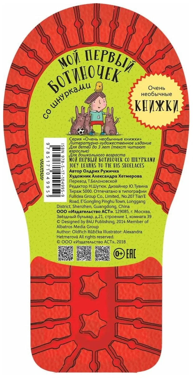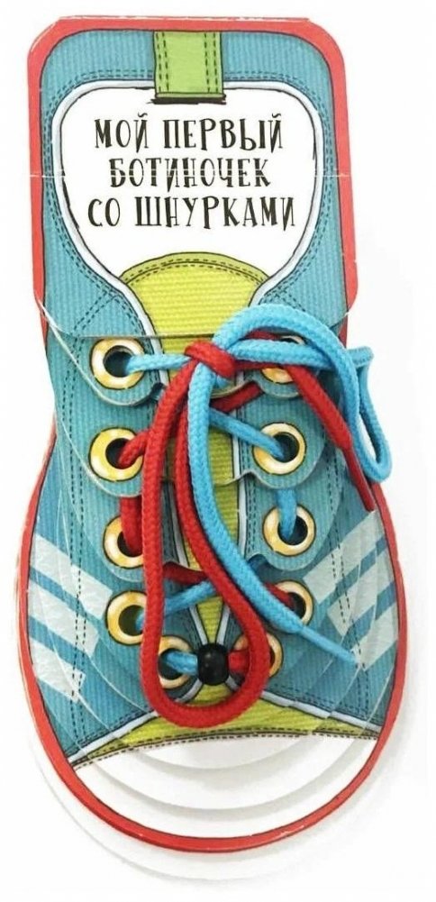 18 страничек на очень плотном картоне с фигурной вырубкой В ФОРМЕ БОТИНОЧКА. Разноцветные шнурки, которые ребенок может завязывать сам. Увлекательный рассказ, а также по 2 забавных способа завязывать шнурки в каждой книге.