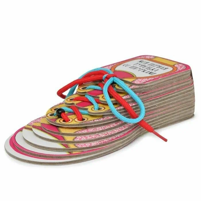 18 страничек на очень плотном картоне с фигурной вырубкой В ФОРМЕ ТУФЕЛЬКИ. Разноцветные шнурки, которые ребенок может завязывать сам. Увлекательный рассказ, а также по 2 забавных способа завязывать шнурки в каждой книге.