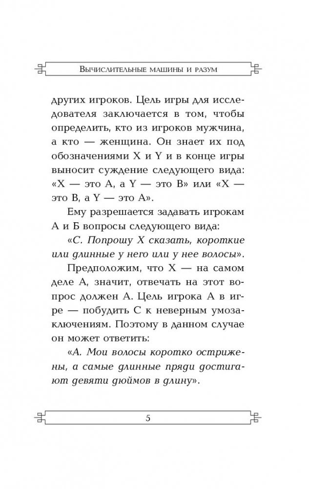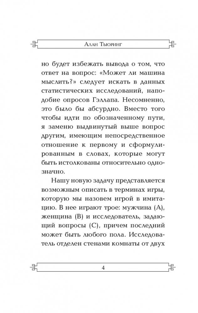 Впервые опубликованная еще в 1950 году, его знаменитая статья «Вычислительные машины и разум» стала одной из самых издаваемых и обсуждаемых работ в области информатики и кибернетики. Что и неудивительно – ведь именно в ней Тьюринг впервые сформулировал само понятие искусственного интеллекта и задал сакраментальный вопрос: «Может ли машина мыслить?» Так могут ли думать компьютеры? Тьюринг, при всей своей гениальности, был человеком практического склада ума и научно-фантастическими вопросами не задавался, а потому поставил вопрос несколько иначе: может ли компьютер совершать действия, не отличимые от обдуманных действий человека? И что, собственно, такое искусственный интеллект и чем он отличается от человеческого? И почему неверно считать, что компьютер, в отличие от человека, не способен на самопознание? На некоторые вопросы Тьюринга в наши дни уже дан ответ. Но многие из них так и повисли в воздухе в ожидании нового гения…
