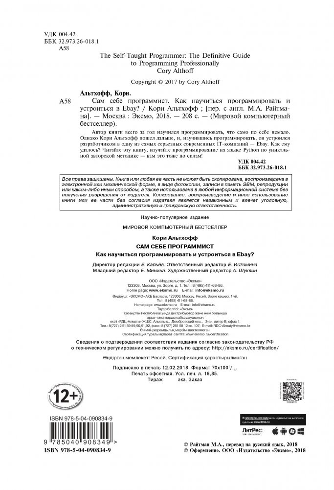 Автор книги всего за год научился программировать, что само по себе немало. Однако Кори Альтхофф пошел дальше, и, научившись программировать, он устроился разработчиком в одну из самых серьезных современных IT-компаний — Ebay. Как ему удалось? Читайте эту книгу, изучайте программирование на языке Python по уникальной авторской методике — вам это тоже по силам!