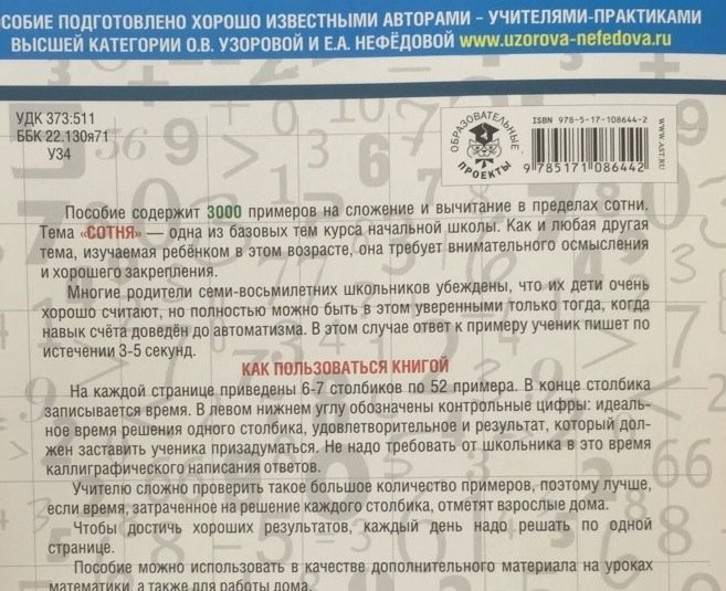 Данное пособие содержит 3000 примеров на сложение и вычитание в пределах сотни. Тема «СОТНЯ» – одна из базовых тем курса начальной школы. Как и любая другая тема, изучаемая ребёнком в этом возрасте, она требует внимательного осмысления и хорошего закрепления. Многие родители семи-восьмилетних школьников убеждены, что их дети очень хорошо считают, но полностью можно быть в этом уверенными только тогда, когда навык счёта доведён до автоматизма. В этом случае ответ к примеру ученик пишет по истечении 3 – 5 секунд.