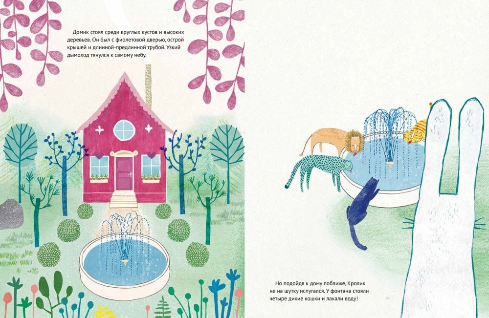 Кролик купил себе летний домик и отправился в отпуск. Однако возле домика он обнаружил четырех диких кошек, которые лакали воду из фонтана! Кролик страшно перепугался. Что же делать? Шведская художница Ульрика Кестере сочинила и нарисовала историю о том, что даже страшные дикие кошки могут стать твоими друзьями, надо лишь попробовать найти к ним подход. Для дошкольного возраста.