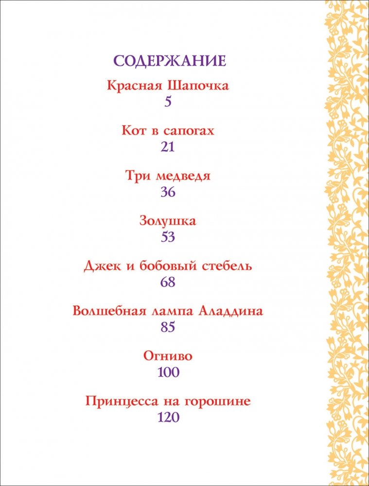 В сборник вошли самые известные и любимые сказки: «Красная Шапочка», «Кот в сапогах», «Золушка», «Аладдин», «Джек и бобовый стебель» и другие. Благодаря простому и понятному тексту, эти сказки смогут прочитать даже начинающие маленькие читатели. Книгу украшают великолепные иллюстрации всемирно известного художника Джона Пейшенса.