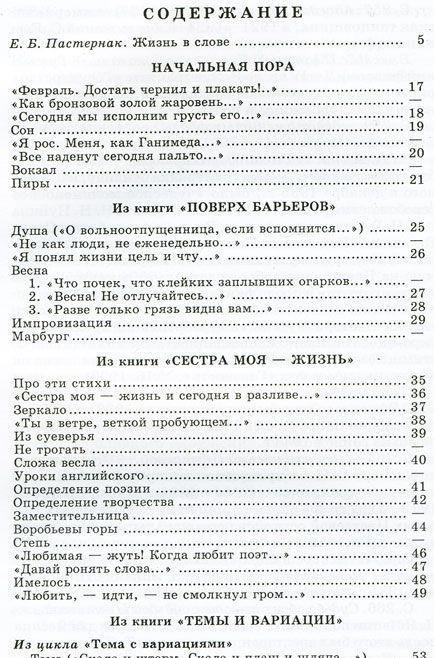В сборник выдающегося лирического поэта XX века Б.Л. Пастернака вошли произведения из книг "Поверх барьеров", "Сестра моя - жизнь", "На ранних поездах", "Когда разгуляется" и др., а также избранные переводы классиков зарубежной поэзии (В. Шекспира, И.В. Гете, Дж. Г. Байрона, П. Верлена и др.) и автобиографический очерк "Люди и положения".