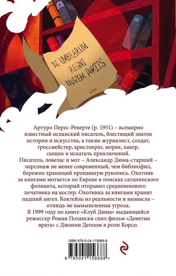 Книги дают взрослым людям пищу для ума, козыри для игры и костюмы для маскарада. Букинисты почти правят миром. Писатель, ловелас и мот Александр Дюма-старший — персонаж не менее современный, чем библиофил, бережно хранящий пропавшую рукопись. Охотник за книгами мотается по Европе в поисках сатанинского фолианта, который отправил средневекового печатника на костер. Охотника за книгами хранит падший ангел. Коктейль из реальности и вымысла — отнюдь не вымышленная угроза. В книгах Артуро Переса-Реверте возрождается литература, которую мы всегда любили. В 1999 году по книге "Клуб Дюма" выдающийся режиссер Роман Полански снял фильм "Девятые врата" с Джонни Деппом в роли Корсо.