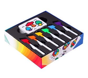 Вдохните жизнь в чёрно-белые картинки! Бросьте взгляд на цветную версию, переверните карту и постарайтесь раскрасить её точно так же... и быстрее всех! Чем лучше вы справитесь, тем больше очков получите, но не дайте коварным маркерам сбить вас с толку, ведь в каждом раунде колпачки на них меняются местами!