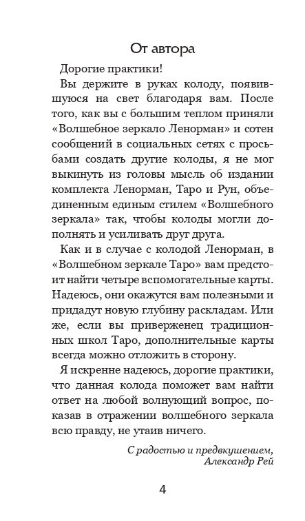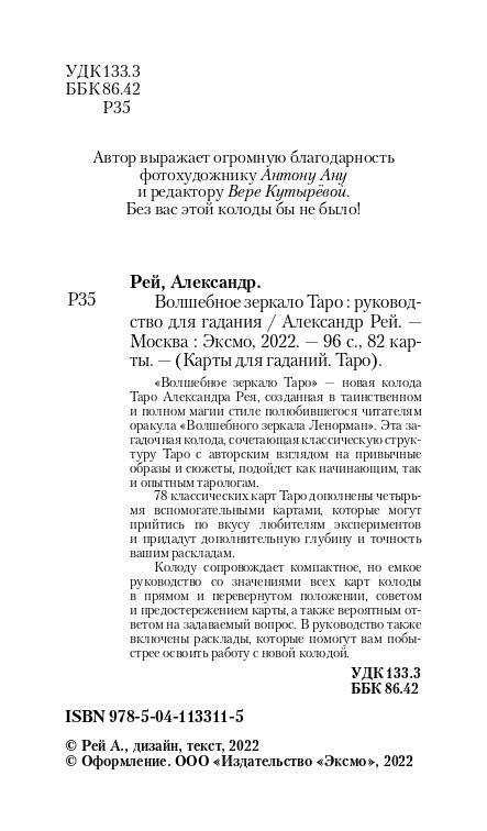 "Волшебное зеркало Таро" - новая колода Таро Александра Рея, созданная в таинственном и полном магии стиле полюбившегося читателям оракула "Волшебного зеркала Ленорман". Эта загадочная колода, сочетающая классическую структуру Таро с авторским взглядом на привычные образы и сюжеты, подойдет как начинающим, так и опытным тарологам. 78 классических карт Таро дополнены четырьмя вспомогательными картами, которые могут прийтись по вкусу любителям экспериментов и придадут дополнительную глубину и точность вашим раскладам. Колоду сопровождает компактное, но емкое руководство со значениями всех карт колоды в прямом и перевернутом положении, советом и предостережением карты, а также вероятным ответом на задаваемый вопрос. В руководство также включены расклады, которые помогут вам побыстрее освоить работу с новой колодой.