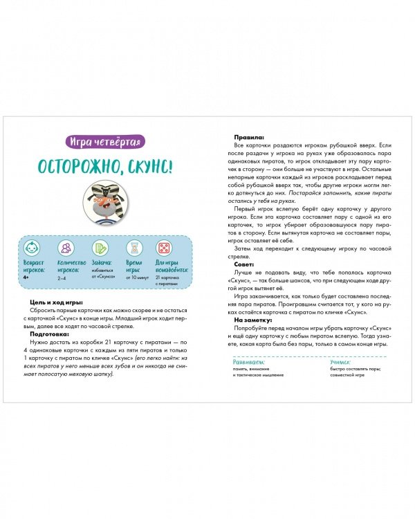 «Пиратская математика» включает 5 вариантов игр. Основная игра “Остров сокровищ” с ходьбой фишками по полю подойдет как для пиратов помладше (от 4 лет), так и для капитанов постарше (от 6 лет).