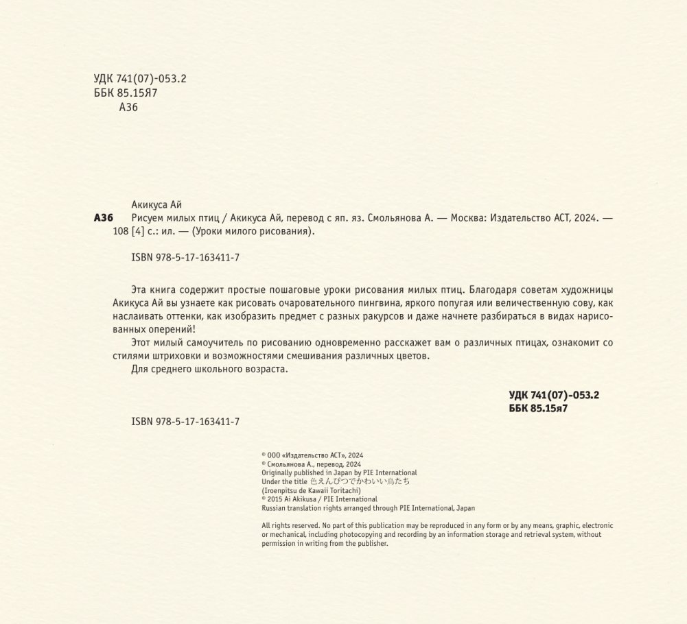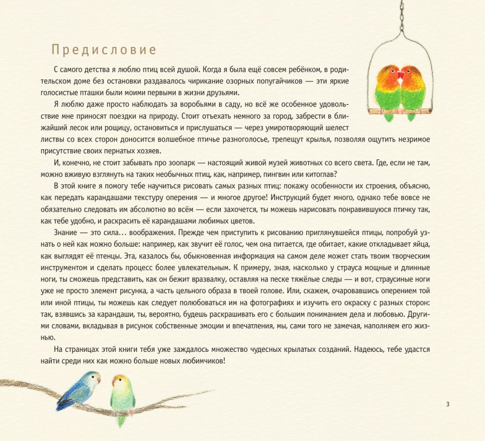 Эта книга содержит простые пошаговые уроки рисования милых птиц. Благодаря советам художницы Акикуса Ай вы узнаете как рисовать очаровательного пингвина, яркого попугая или величественную сову, как наслаивать оттенки, как изобразить предмет с разных ракурсов и даже начнете разбираться в видах нарисованных оперений!