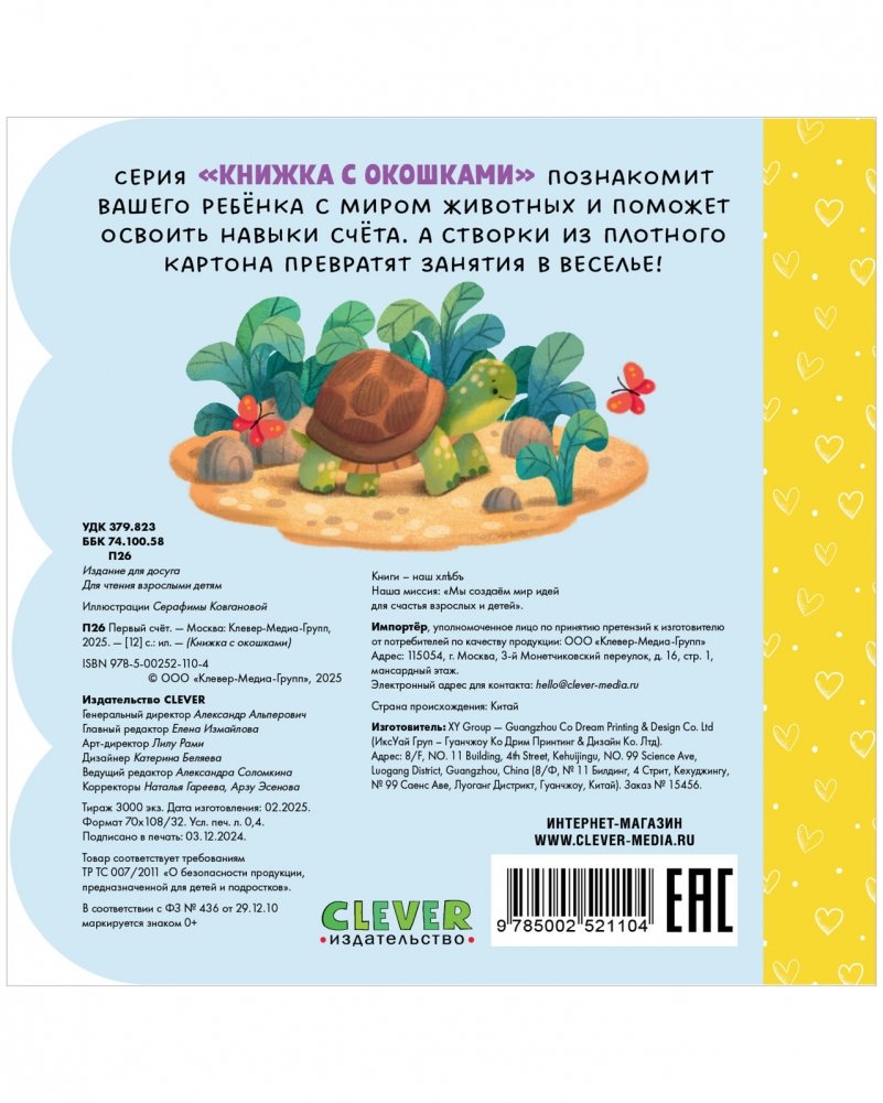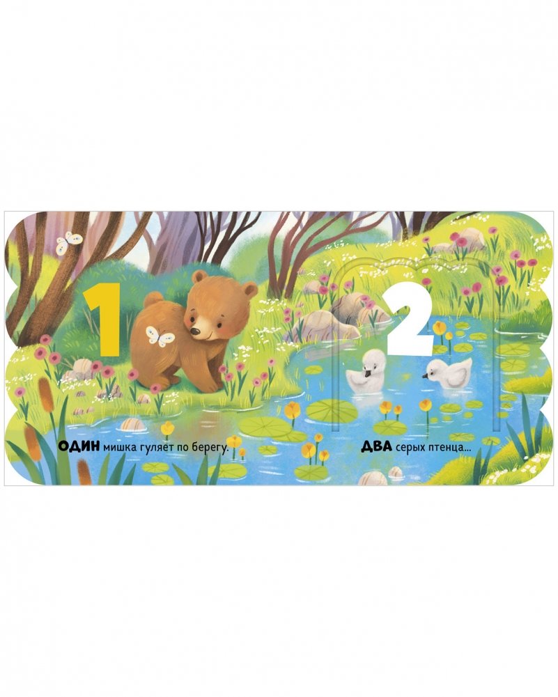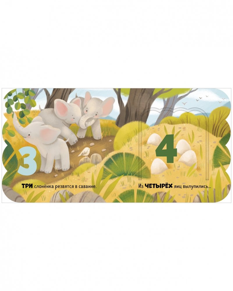 1 мишка, 2 птенца, 3 слоненка, 6 бутонов, 9 хомячков… «Первый счет» — чудесная первая книга малыша из прочного картона с пятью окошками для игры и развития мелкой моторики, книга для малышей, которая познакомит с животными и с цифрами до 10.