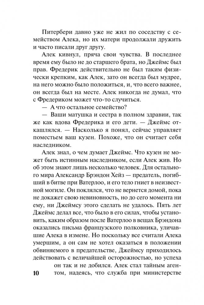 Когда-то Александр Хейз был блестящим офицером, героем, человеком чести, а теперь, ни в чем не повинный, ославлен предателем. Чтобы восстановить свое доброе имя, он вынужден стать тайным агентом короля. Семья считает Александра давно погибшим. Бывшие друзья отвернулись. И единственная, кто может помочь ему выполнить опасное задание, — Крессида Тернер, которая не доверяет предателю, но вынуждена с ним сотрудничать. Однако очень скоро Крессида влюбляется в Алека, и эта любовь может подарить им счастье — или стоить жизни…