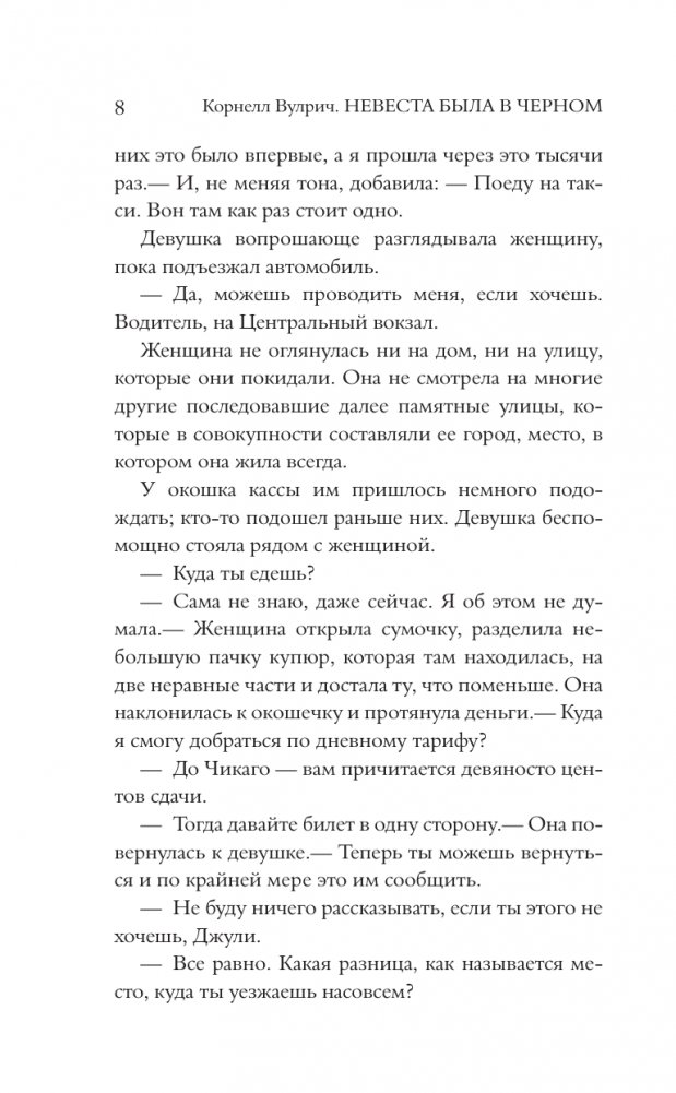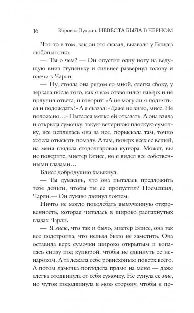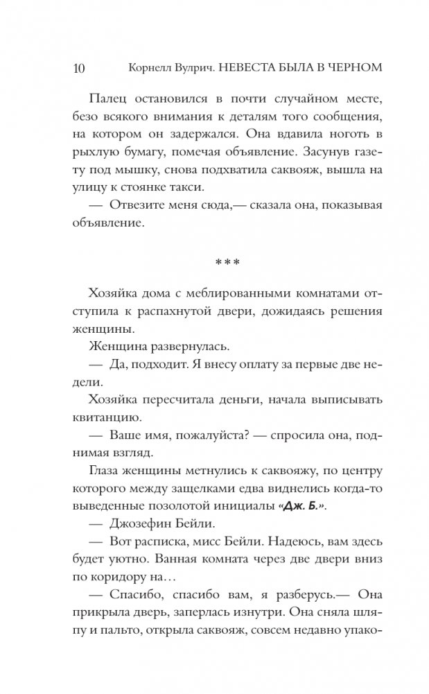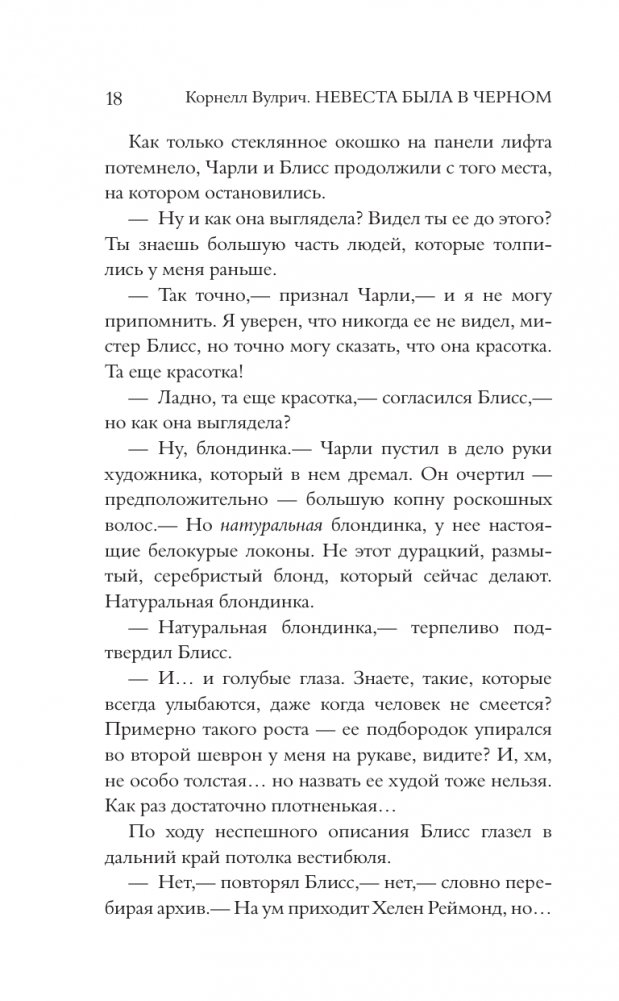 "Невеста была в черном" — один из самых популярных и знаменитых романов Вулрича. Когда богатый жених прямо во время вечеринки по поводу своей помолвки падает с балкона и разбивается насмерть, полиция решает, что это несчастный случай. И только детектив Вангер, узнав, что незадолго до смерти рядом с погибшим видели таинственную незнакомку, подозревает, что на самом деле произошло убийство. Когда же при странных обстоятельствах умирает еще двое мужчин, которых видели в компании никому не известной женщины, примечательной своей красотой, Вангер понимает, что перед ним целая серия преступлений. Но что объединяет людей, которые на первый взгляд не знали друг друга? И почему кто-то пожелал им смерти?