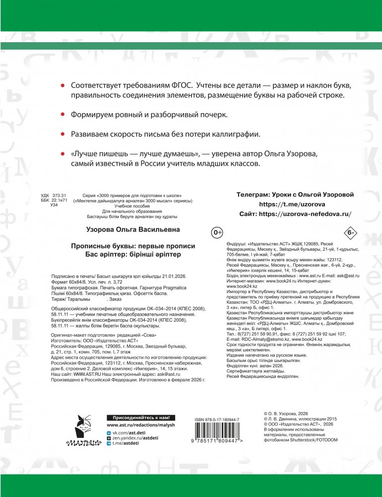 "Прописные буквы: первые прописи" — это новейшие прописи, разработанные по авторской методике самого известного в России учителя младших классов Ольги Узоровой. Основная цель пособия — довести до автоматизма написание всех букв. Отработка элементов в правильном порядке позволяет избежать многих ошибок и сразу сформировать красивый почерк. Устойчивый положительный результат всего за 10-15 минут ежедневных занятий — это реально.
