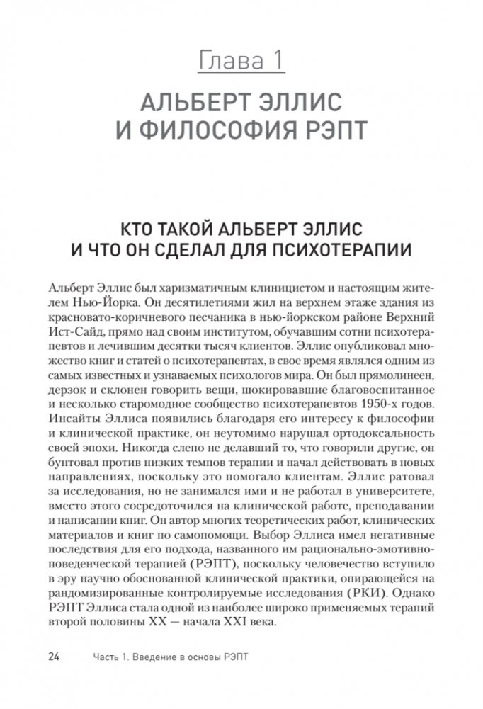 На сегодняшний день рационально-эмотивно-поведенческая психотерапия считается одним из наиболее эффективных методов психотерапии. Большая часть клинической мудрости и рекомендаций настоящего издания - это наследие выдающихся терапевтов, талантливых учеников Альберта Эллиса, многие годы работавших вместе с ним в основанном им институте, а в настоящее время являющиеся его руководителями и ведущими преподавателями, мировыми экспертами в области РЭПТ. Данная книга одна из базовых для обучения когнитивно-поведенческого терапевта и тем более специалиста в рационально-эмотивно-поведенческой терапии (РЭПТ). Начинающие специалисты и более опытные коллеги смогут найти для себя много полезных и важных техник и методик, теоретического и практического материала, бережно передающего суть элегантного подхода Эллиса, акцент на гуманистической и экзистенциальной составляющей его терапии, которая делает когнитивных подход более наполненным эмоциями, ценностями и смыслами. Так же в этой книге вы откроете для себя современное прочтение РЭПТ, активно развиваемое в первую очередь именно авторами этого руководства.