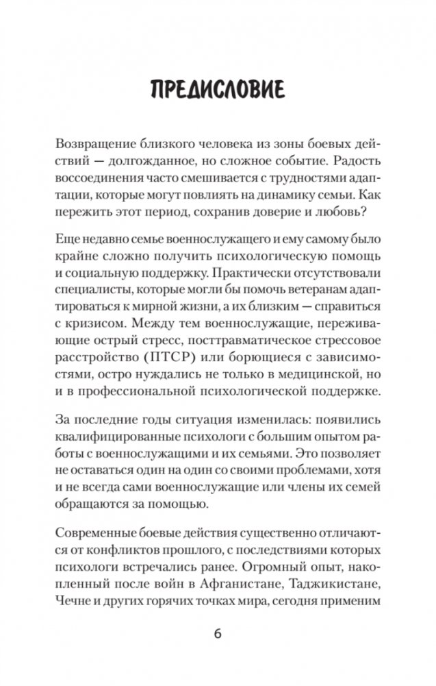 Книга посвящена сложной семейной проблематике: посттравматическое стрессовое расстройство, изменение личности и поведения комбатанта отражаются на психологическом состоянии всех членов семьи. Жены говорят: «Он вернулся — это большое счастье». Но как понять, что происходит c мужем? Как помочь семье и детям? Когда важно обращаться к специалистам? На все эти вопросы отвечает эксперт в области психотравматологии О. В. Защиринская и коллеги — практикующие специалисты-психологи.