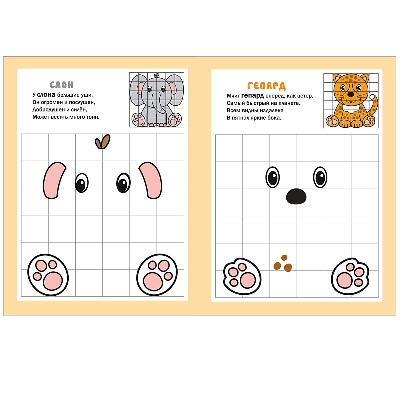 С книгой «В Африке» серии «Рисуем по клеточкам» так легко научиться рисовать слона, жирафа, льва и других животных! На каждой странице малыш найдет поле в клеточку, на котором обозначены некоторые элементы рисунка. Задача маленького художника – дорисовать картинку, глядя на образец в правом верхнем углу. Сделать это будет совсем не сложно, и благодаря забавным стихам – весело. Рисование по клеточкам способствует развитию мелкой моторики, художественного восприятия, пространственного и логического мышления, а также концентрации внимания.