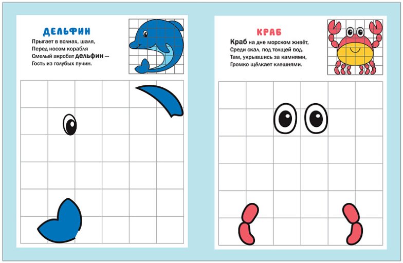 С книгой «В море» серии «Рисуем по клеточкам» так легко научиться рисовать кита, дельфина, морского конька и других животных! На каждой странице малыш найдет поле в клеточку, на котором обозначены некоторые элементы рисунка. Задача маленького художника – дорисовать картинку, глядя на образец в правом верхнем углу. Сделать это будет совсем не сложно, и благодаря забавным стихам – весело. Рисование по клеточкам способствует развитию мелкой моторики, художественного восприятия, пространственного и логического мышления, а также концентрации внимания.