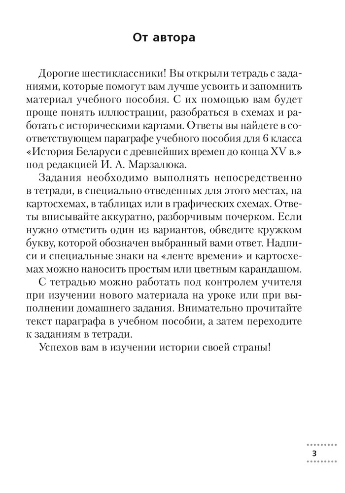 Рабочая тетрадь подготовлена в соответствии с программой и учебным пособием по истории Беларуси для 6 класса под редакцией доктора исторических наук, профессора И. А. Марзалюка. В ней приведены задания разного уровня сложности, направленные на закрепление и проверку знаний, а также формирование картографических и хронологических умений учащихся. Карты для удобства пользования представлены в тетради в виде картосхем.