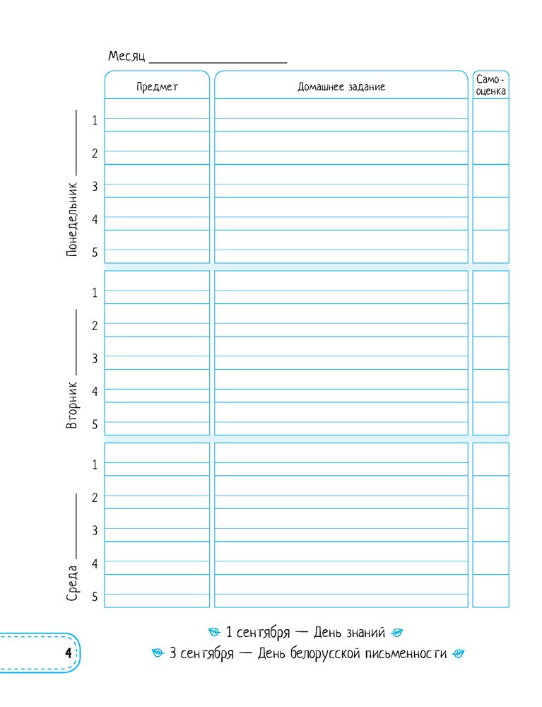 Помимо расписания уроков и домашних заданий, в «Дневничке» можно записать дополнительные мероприятия на каждую неделю, планы на каникулы, в отдельные разделы – замечания, благодарности, рекомендации учителя. В конце издания приводятся правила заполнения и ведения «Дневничка».