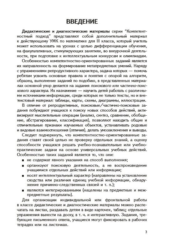 Дидактические и диагностические материалы — это дополнительный материал к действующему УМК по математике для 3-го класса, который учитель может использовать на уроках, факультативных, стимулирующих занятиях, во внеучебной деятельности при подготовке к интеллектуальным конкурсам и олимпиадам.