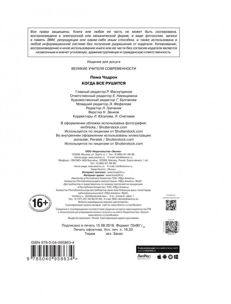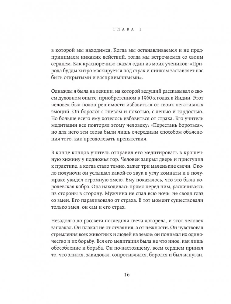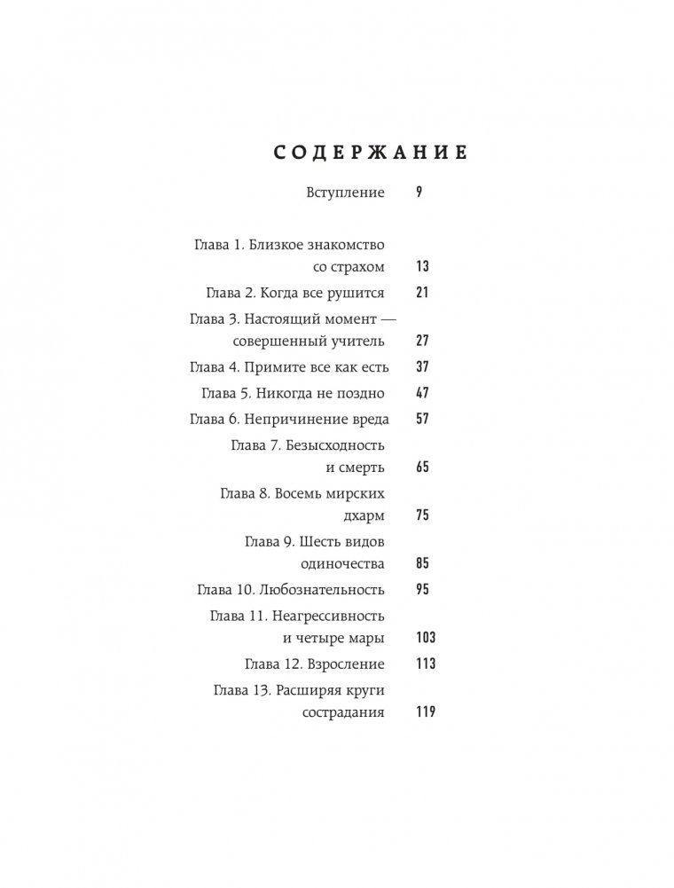 Эта книга — о временах, когда вся жизнь рушится. Ее автор — одна из первых западных женщин, ставшая буддийской монахиней Пема Чодрон. Основываясь на поучениях своих учителей — легендарных мастеров медитации и практиков тибетского буддизма — она рассказывает, как проживать самые трудные периоды жизни и как совладать с душевной болью. До монашества Пема Чодрон жила довольно обычной жизнью: работала учительницей в школе, дважды выходила замужем, родила троих детей. В своих книгах она упоминает, что именно трудности в личных отношениях помогли ей найти ответы на глубинные внутренние вопросы и изменить себя.