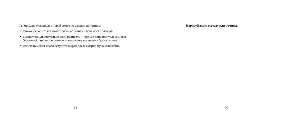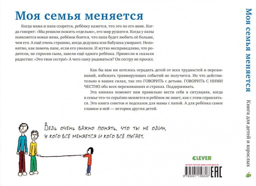 Важную роль в книге «Моя семья меняется» играют иллюстрации, а также то, что в ней можно писать и рисовать. Главное — не просто читать книгу, а разговаривать с ребенком о прочитанном.