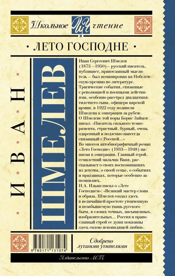 Во многом автобиографичный роман "Лето Господне" (1933—1948) написан в эмиграции. Главный герой, семилетний мальчик Ваня, рассказывает о своих воспоминаниях из детства, о своей семье, о событиях и праздниках, которые особенно запомнились.