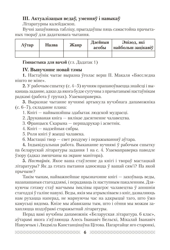 Дапаможнік змяшчае метадычныя распрацоўкі ўрокаў беларускай літаратуры для 6 класа. Прапанаваны матэрыял адпавядае вучэбнай праграме і дапаможа педагогам у арганізацыі і правядзенні заняткаў.