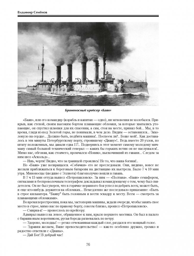 В.И. Семёнов был единственным офицером Российского Императорского флота, которому в годы Русско-японской войны довелось служить и в Первой, и во Второй Тихоокеанских эскадрах и участвовать в обоих главных морских сражениях – в Порт-Артуре и при Цусиме. В последнем бою, находясь на флагмане русской эскадры, Семёнов получил пять ранений и после возвращения из японского плена прожил совсем недолго, но успел дополнить и обработать свои дневники, которые вел во время боевых действий.