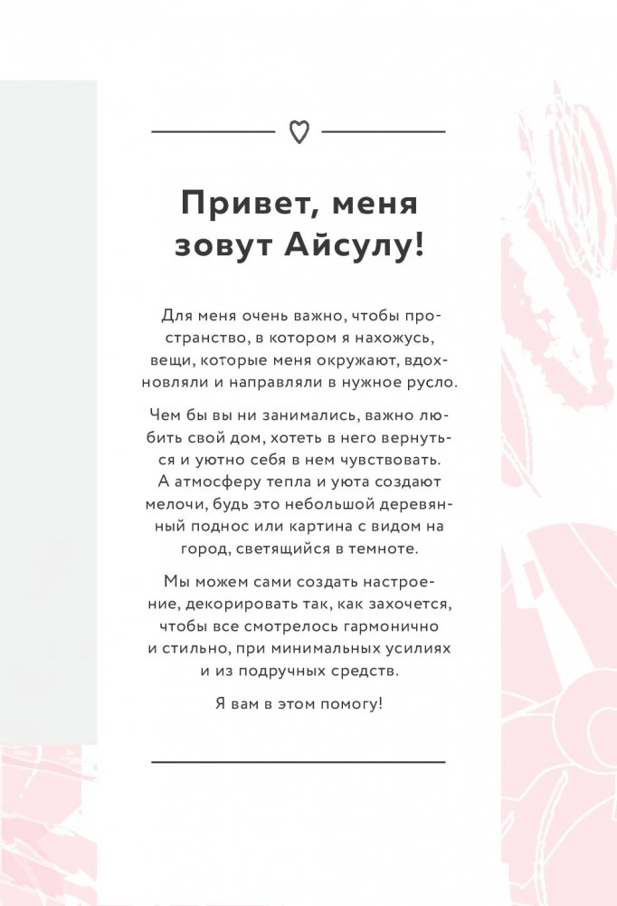 Айсулу Нуртаева (Fancy smth.) уверена, что вдохновляющее пространство - залог успеха! Чем бы вы ни занимались, важно любить свой дом, хотеть в него вернуться и уютно себя в нем чувствовать. В этой книге собрано 12 стильных проектов от Айсулу, которые помогут создать атмосферу тепла и уюта у себя дома. Деревянный поднос, картина с видом на город, светящийся в темноте, бетонная рука-подставка и многое другое. Каждый проект сопровождается подробными инструкциями, пошаговыми фотографиями и советами.