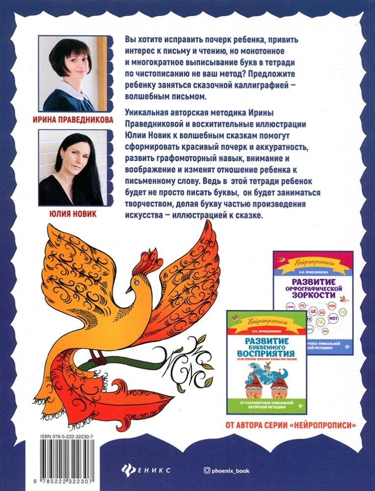 Уникальная авторская методика Ирины Праведниковой и восхитительные иллюстрации Юлии Новик к волшебным сказкам помогут сформировать красивый почерк и аккуратность, развить моторный навык, внимание и воображение и изменят отношение ребёнка к письму. Ведь в этой тетради ребёнок будет не просто учиться писать буквы, но и заниматься творчеством, делая букву частью произведения искусства — иллюстрацией к сказке.