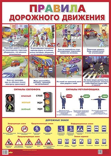 Обучающий плакат "Правила дорожного движения" познакомит детей с основными правилами, которые необходимо соблюдать пешеходу, а также с сигналами светофора и регулировщика, основными дорожными знаками.