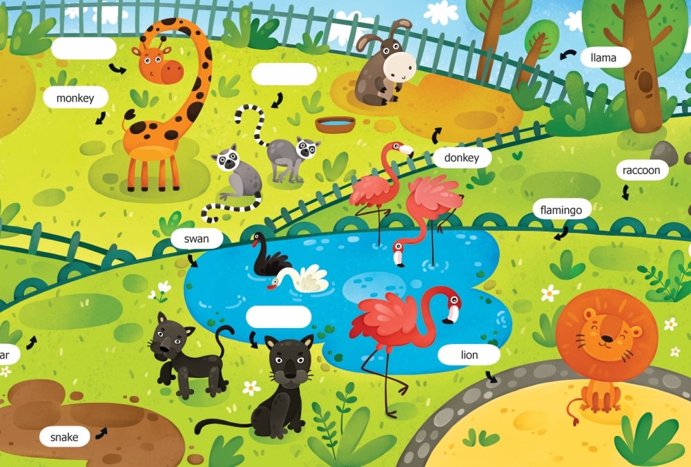 Первые слова. Английский язык. Зоопарк. Обучающая книжка с наклейками