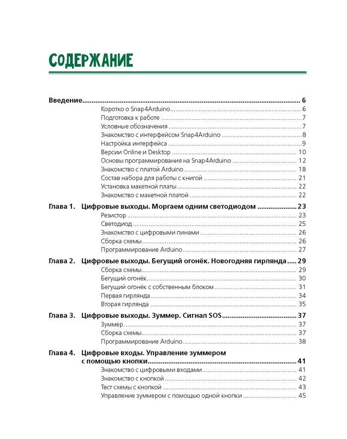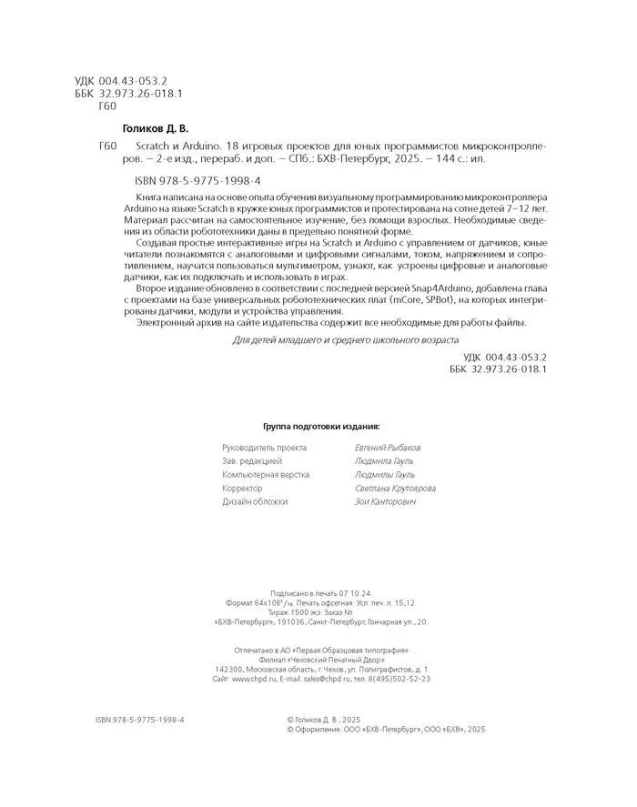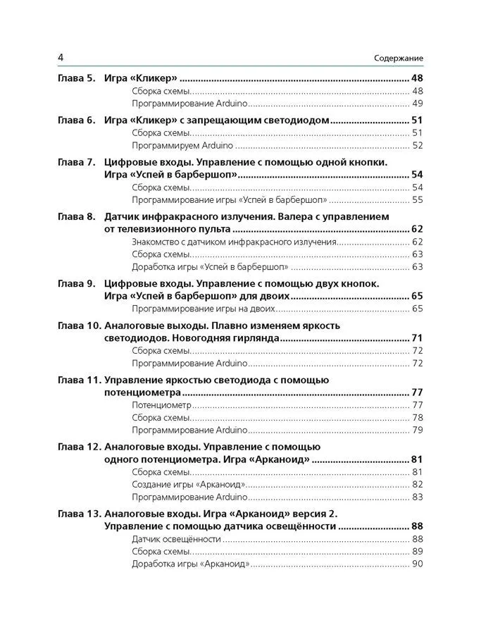 Книга написана на основе опыта обучения визуальному программированию микроконтроллера Arduino на языке Scratch в кружке юных программистов и протестирована на сотне детей 7-12 лет. Материал рассчитан на самостоятельное, без помощи взрослых, изучение школьниками, имеющими базовые навыки управления компьютером. Необходимые сведения из области электроники и микропроцессорной техники даны в предельно простой и понятной форме. Создавая простые интерактивные игры на Scratch и Arduino с управлением от датчиков, юные читатели познакомятся с аналоговыми и цифровыми сигналами, током, напряжением и сопротивлением, научатся пользоваться мультиметром. Дети узнают, как устроены и работают различные цифровые и аналоговые датчики, как их подключать к Arduino и использовать в играх.
