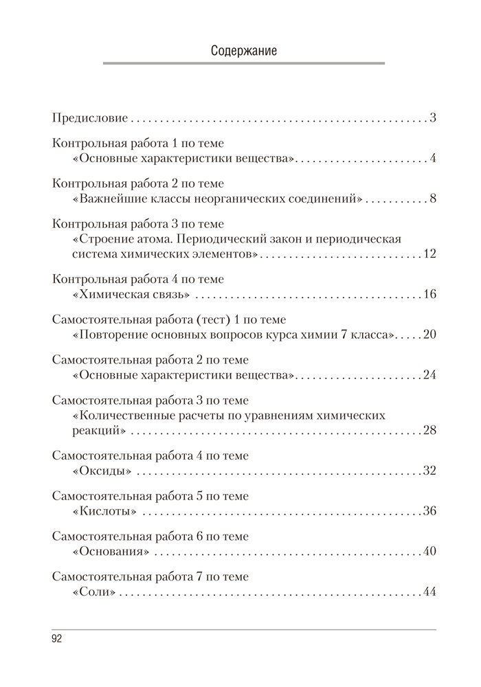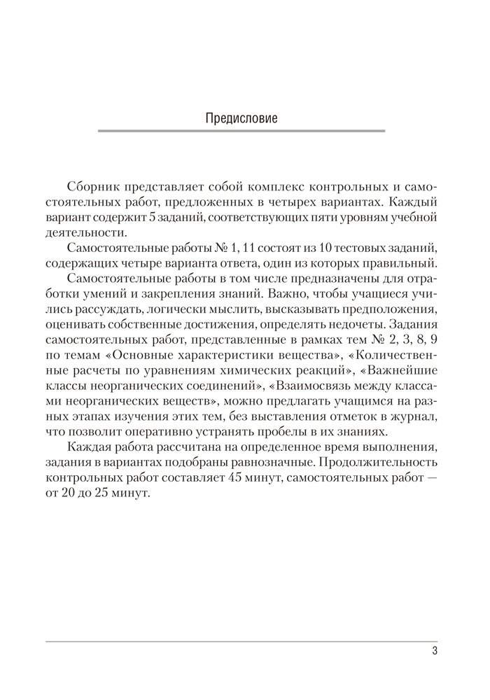 Сборник содержит контрольные и самостоятельные работы по химии для 8 класса, представленные в четырех вариантах. Все варианты включают разноуровневые задания, которые разработаны согласно нормам оценки результатов учебной деятельности учащихся.