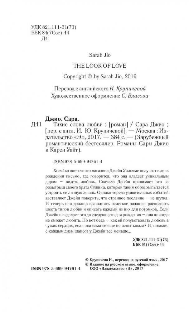 Хозяйка цветочного магазина Джейн Уильямс получает в день рождения письмо, где говорится, что она владеет уникальным даром – видеть любовь. Сначала Джейн принимает это за розыгрыш своего брата Флинна, который таким образом пытается устроить ее личную жизнь. Однако череда удивительных событий заставляет Джейн поверить, что странное послание – не шутка. И теперь она должна выполнить нелегкое задание: распознать шесть типов любви и описать каждый из них для потомков. Если Джейн не сделает это до следующего дня рождения – она никогда не сможет любить. Но вот беда – как ей почувствовать любовь в чужих сердцах, если она сама ее еще не испытывала? И, похоже, с каждым днем шансов у Джейн все меньше…