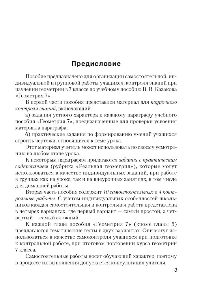 В пособии приведены дидактические материалы по геометрии для 7 класса, содержание которых отвечает требованиям действующей учебной программы, структуре учебного пособия «Геометрия 7» (автор В. В. Казаков) и календарно-тематическому планированию. В издание включены самостоятельные и контрольные работы, тематические тесты, задачи с практическим содержанием.